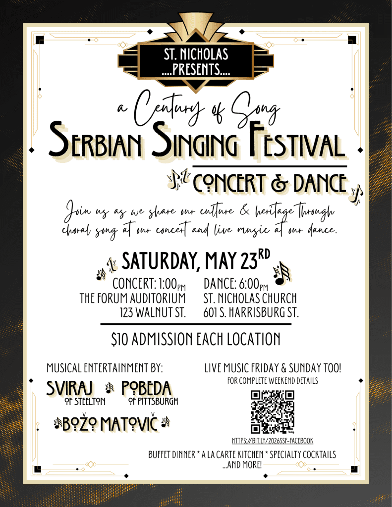 Celebrate A Century of Song! Join St. Nicholas Serbian Orthodox Church this Memorial Day Weekend for our Serbian Singing Festival. We invite you to experience both our spiritual and cultural heritage through vocal arrangements, live bands, dancing, food, and drink. Events costing $10 each Friday (6pm-11pm), Saturday (1pm at Forum-ending 11pm at the church social hall), and Sunday.