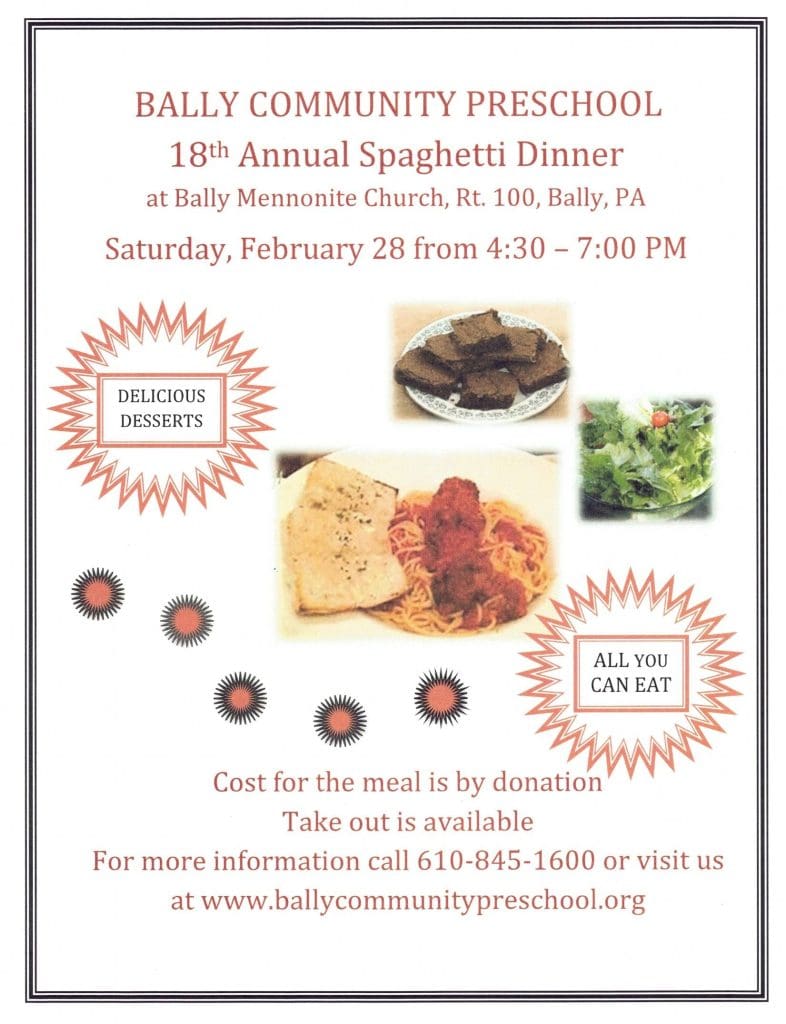 Bally Community Preschool 18th Annual Spaghetti Dinner at Bally Mennonite Church, Route 100, Bally, PA, Saturday, February 28, 4:30 to 7:00pm. Spaghetti & meatball, lit’l smokies, garlic knots, salad, and delicious desserts. All you can eat! Cost for the meal is by donation. Take out is available. Questions? 610-845-1600 or website www.ballycommunitypreschool.org
