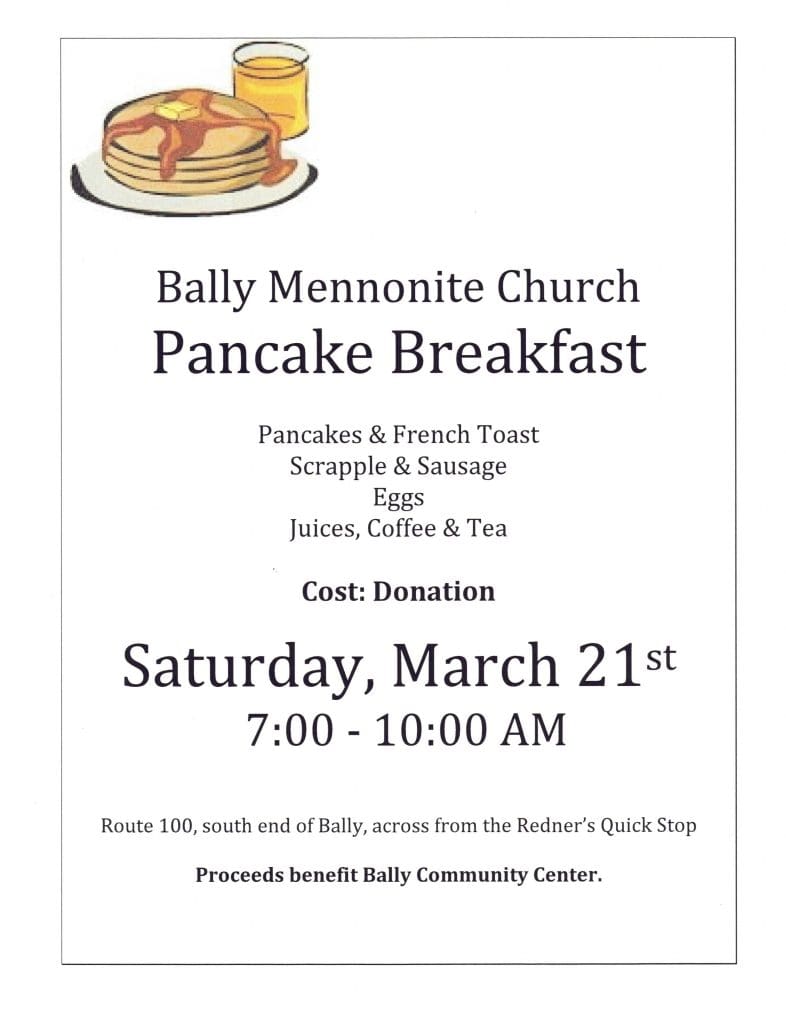 PANCAKE BREAKFAST at Bally Mennonite Church, Route 100, Bally, PA, March 21, 7:00am to 10:00am. Pancakes & French toast, scrapple & sausage, eggs and beverages. All are welcome. Cost: Donation. Proceeds will support Bally Community Center. Questions? 610-845-7780 or see website www.ballymc.org.