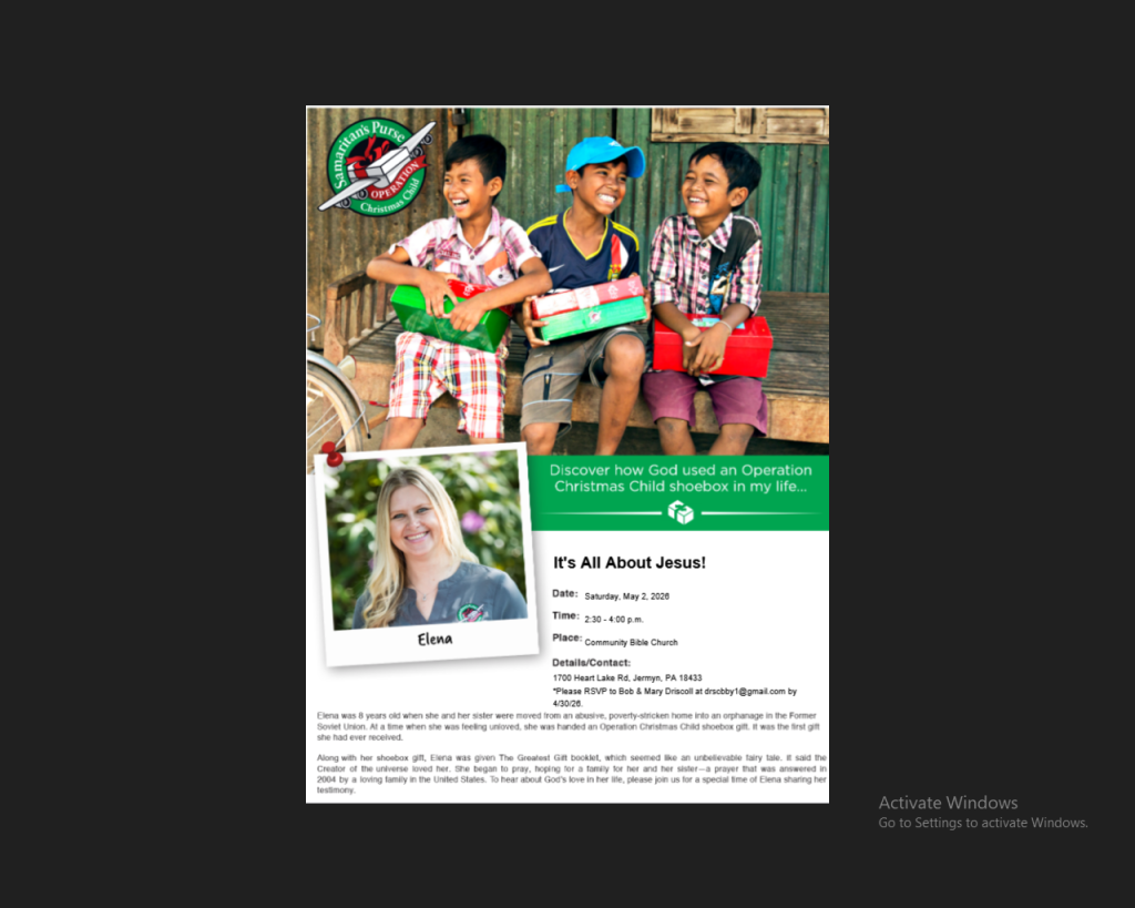“Come find out how a gift-filled shoebox helped a child, who had never received a gift, to grasp that Jesus is God’s Greatest Gift!”