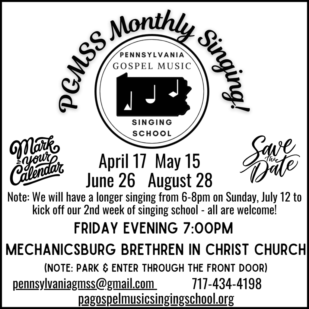 We sing hymns and Gospel songs for about an hour, mostly by request. Anyone is welcome to direct a song! We primarily sing from Mi (form Shaped Note Music Publishing), Favorite Gospel Songs 3rd edition, and the BIC Hymnal. We always have a wonderful time of singing and fellowship!