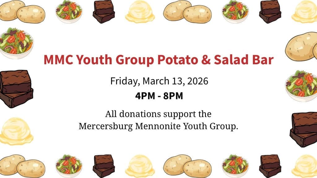 You’re invited to come and enjoy a delicious meal that supports the Mercersburg Mennonite Youth Group. The meal includes baked potatoes, chili, BBQ hot dogs, broccoli and cheese, salad bar, brownies, ice cream and drinks. The cost is by donation. See you there!