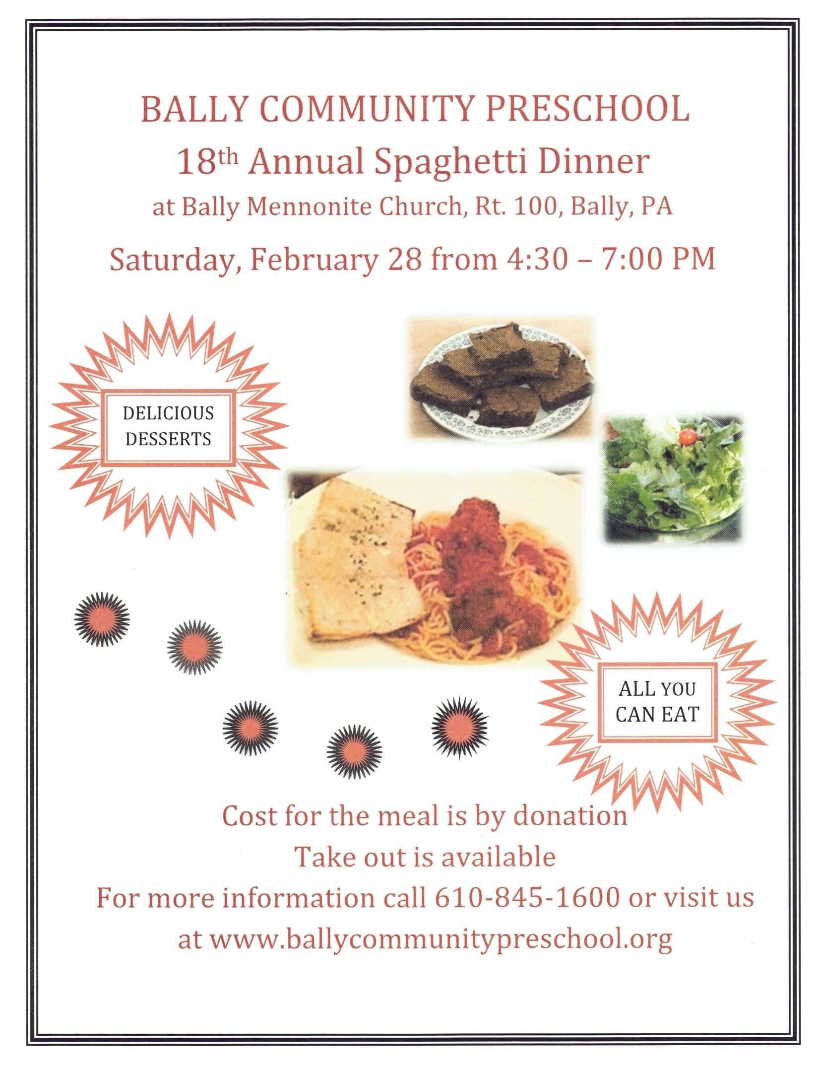 Bally Community Preschool 18th Annual Spaghetti Dinner at Bally Mennonite Church, Route 100, Bally, PA, Saturday, February 28, 4:30 to 7:00pm. Spaghetti & meatball, lit’l smokies, garlic knots, salad, and delicious desserts. All you can eat! Cost for the meal is by donation. Take out is available. Questions? 610-845-1600 or website www.ballycommunitypreschool.org