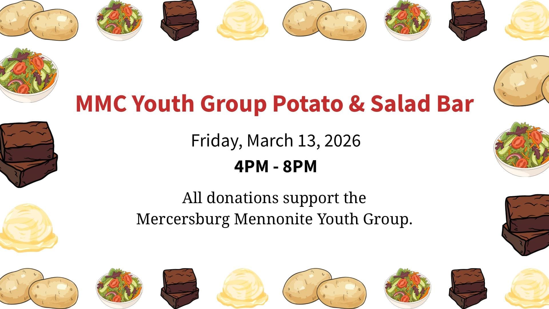 You’re invited to come and enjoy a delicious meal that supports the Mercersburg Mennonite Youth Group. The meal includes baked potatoes, chili, BBQ hot dogs, broccoli and cheese, salad bar, brownies, ice cream and drinks. The cost is by donation. See you there!