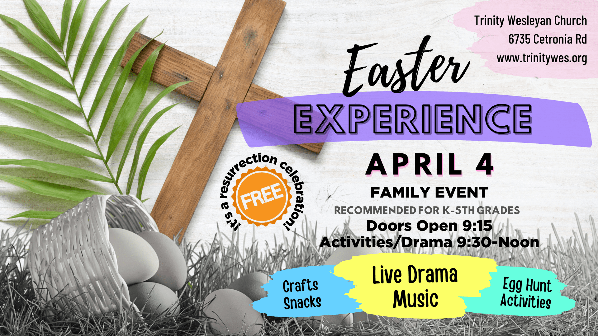 Families, experience the last week of Jesus. Children participate in making crafts, playing fun activities, and creating a special snack to learn more about Jesus. There will be a live drama, portraying the death and resurrection of Jesus. We will have 2 Easter Egg hunt fields - one for Pre-K and one for elementary children. […]