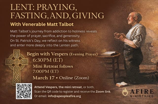 Matt Talbot's journey from addiction to holiness reveals the power of prayer, sacrifice and generosity. On St. Patrick's Day, we reflect on his witness and enter more deeply into the Lenten path. Online via ZOOM. Nightly prayer starts at 6:30, Matt Talbot retreat starts at 7PM. All are welcome!