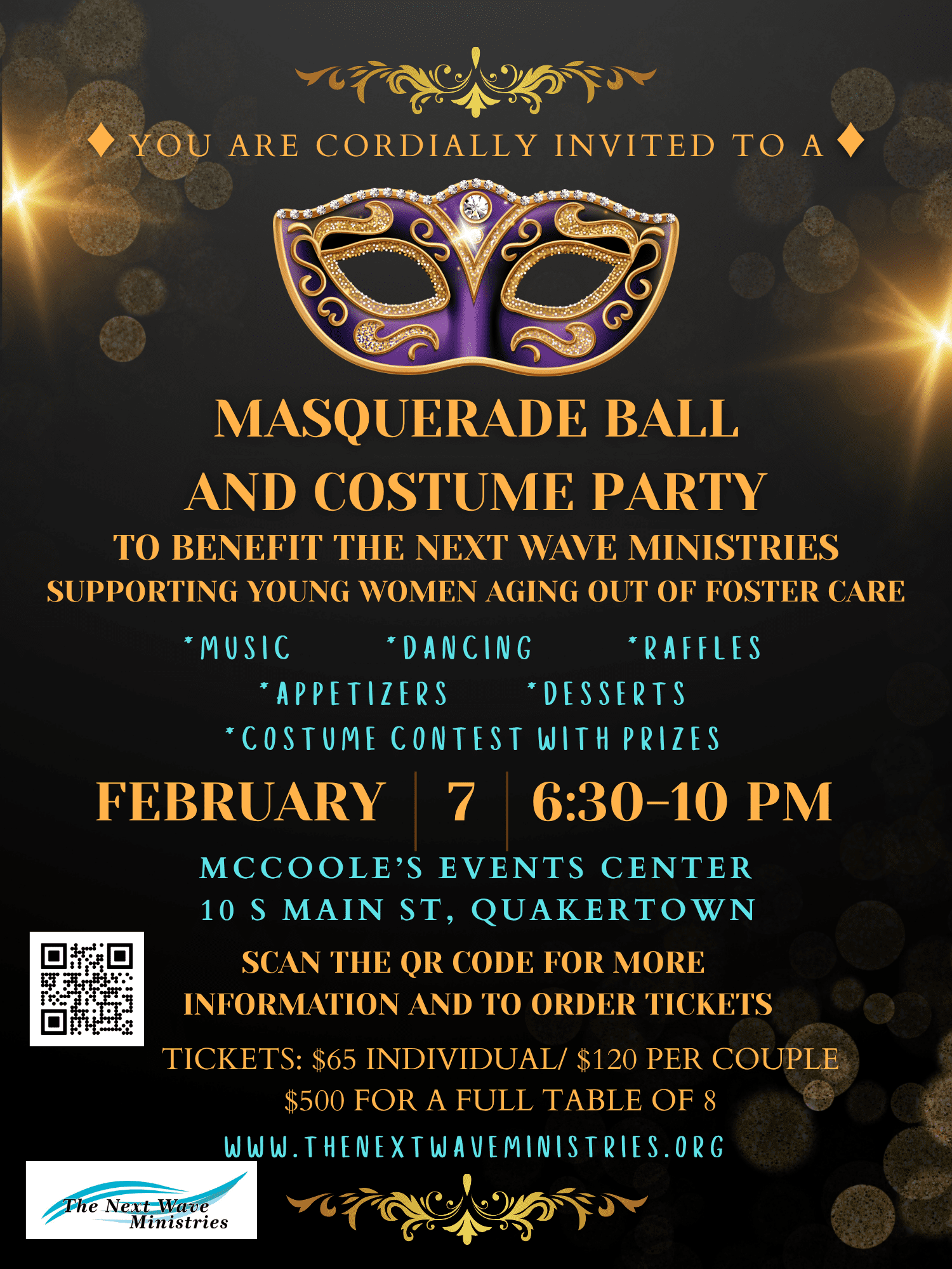 The Next Wave Ministries is hosting a Valentine's Day Masquerade Ball on February 7th at McCoole's Arts and Events Center in Quakertown. This fundraiser event helps us to support young women aging out of foster care in southeastern PA. You can wear typical masquerade ball attire or dress in a historical costume. Prizes will be […]
