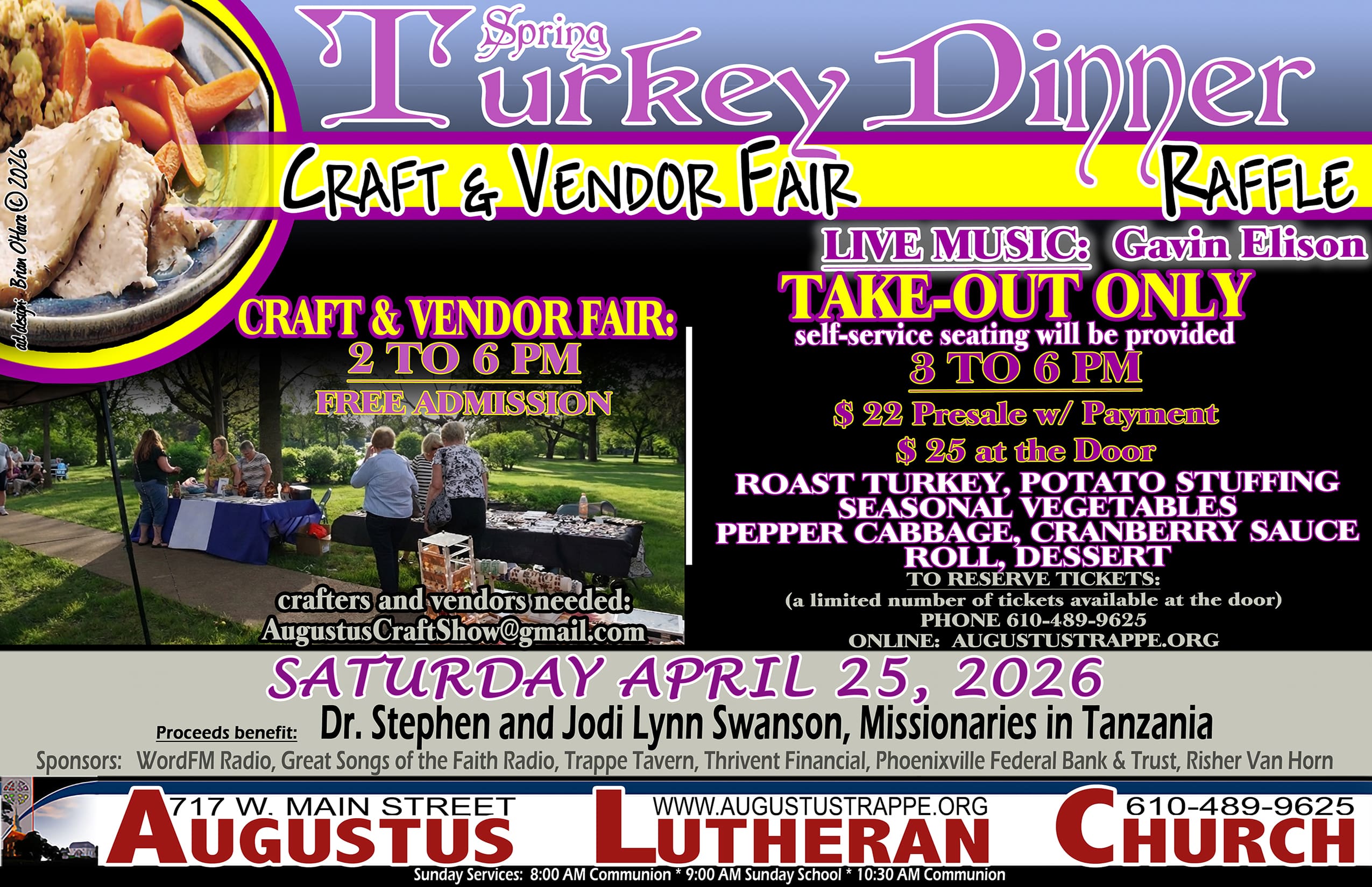 Augustus Lutheran Church in Trappe Pennsylvania (717 W. Main St., Trappe, Pa, 19426) is holding a Spring Turkey Dinner / Craft & Vendor Fair on Saturday April 25, 2026. Tickets for the dinner are only $22.00 presale with payment / $25.00 at the door and it is a take-out only event. The dinner runs from […]