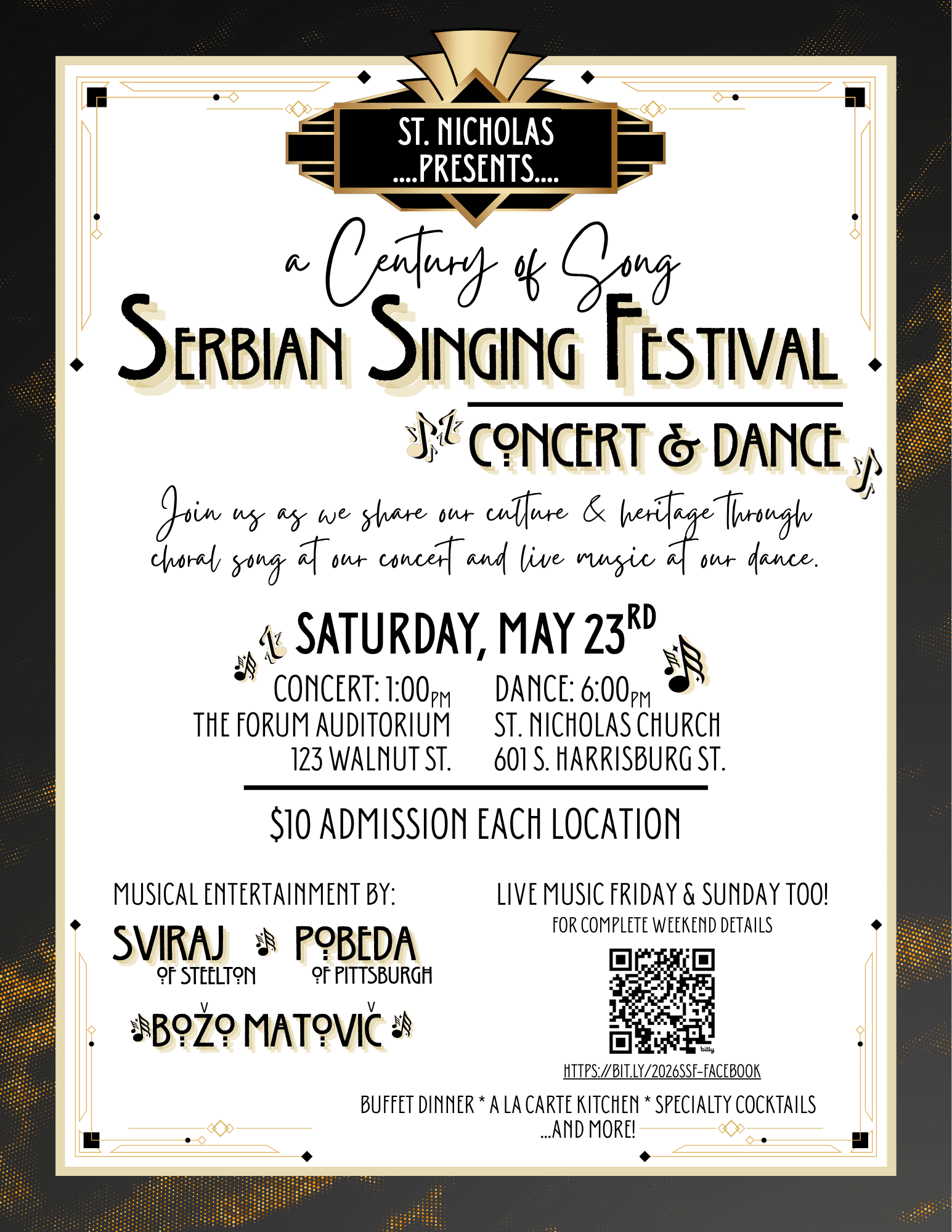 Celebrate A Century of Song! Join St. Nicholas Serbian Orthodox Church this Memorial Day Weekend for our Serbian Singing Festival. We invite you to experience both our spiritual and cultural heritage through vocal arrangements, live bands, dancing, food, and drink. Events costing $10 each Friday (6pm-11pm), Saturday (1pm at Forum-ending 11pm at the church social […]