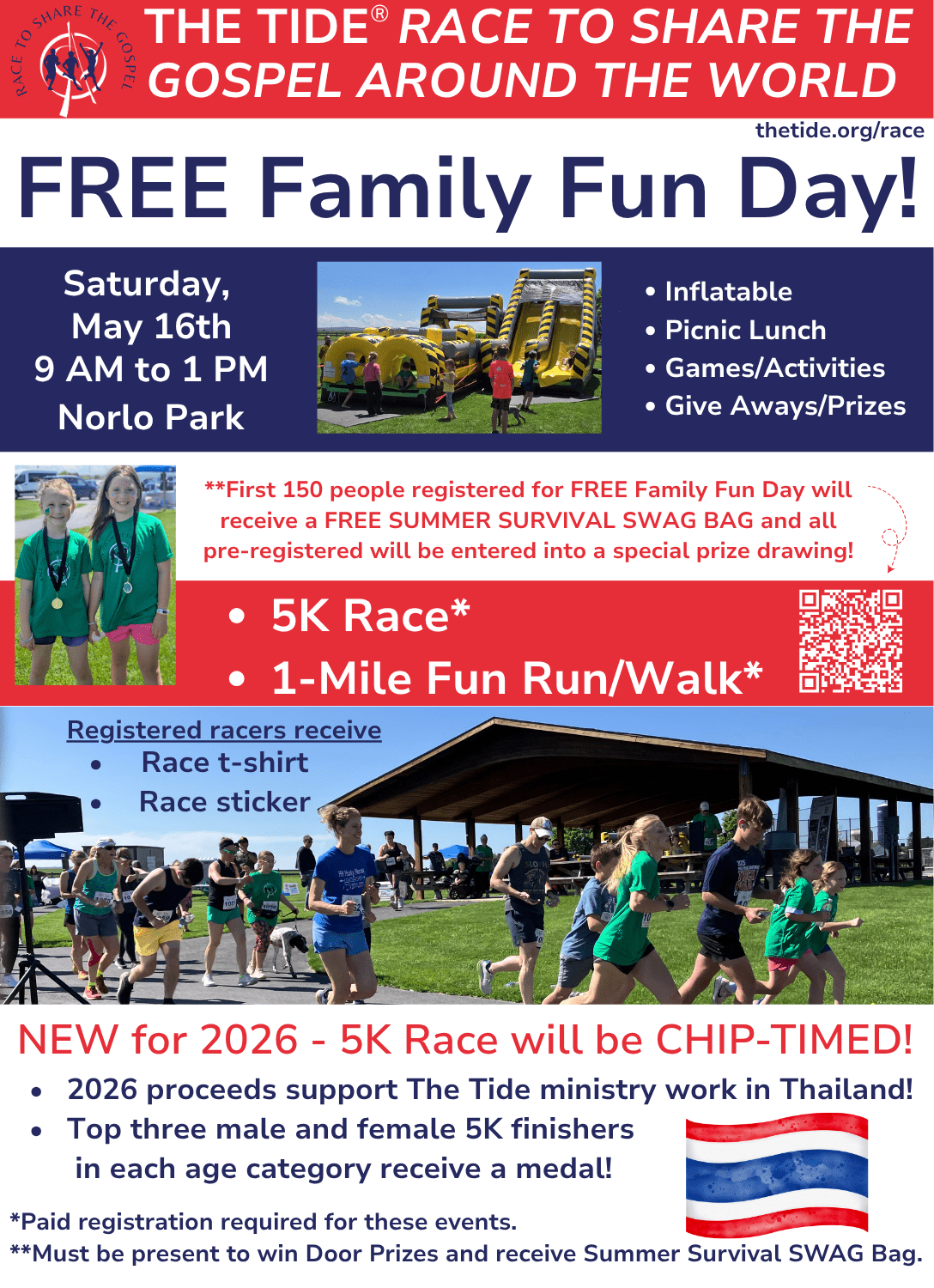 Join The Tide for a FREE Family Fun Day in conjunction with the annual Race to Share the Gospel Around the World 5K Race and 1-Mile Fun Run/Walk. Enjoy games, prizes, lunch, and more! Pre-register for the event by 5 PM on May 15th to be entered into a special prize drawing. 3050 Lincoln Way E