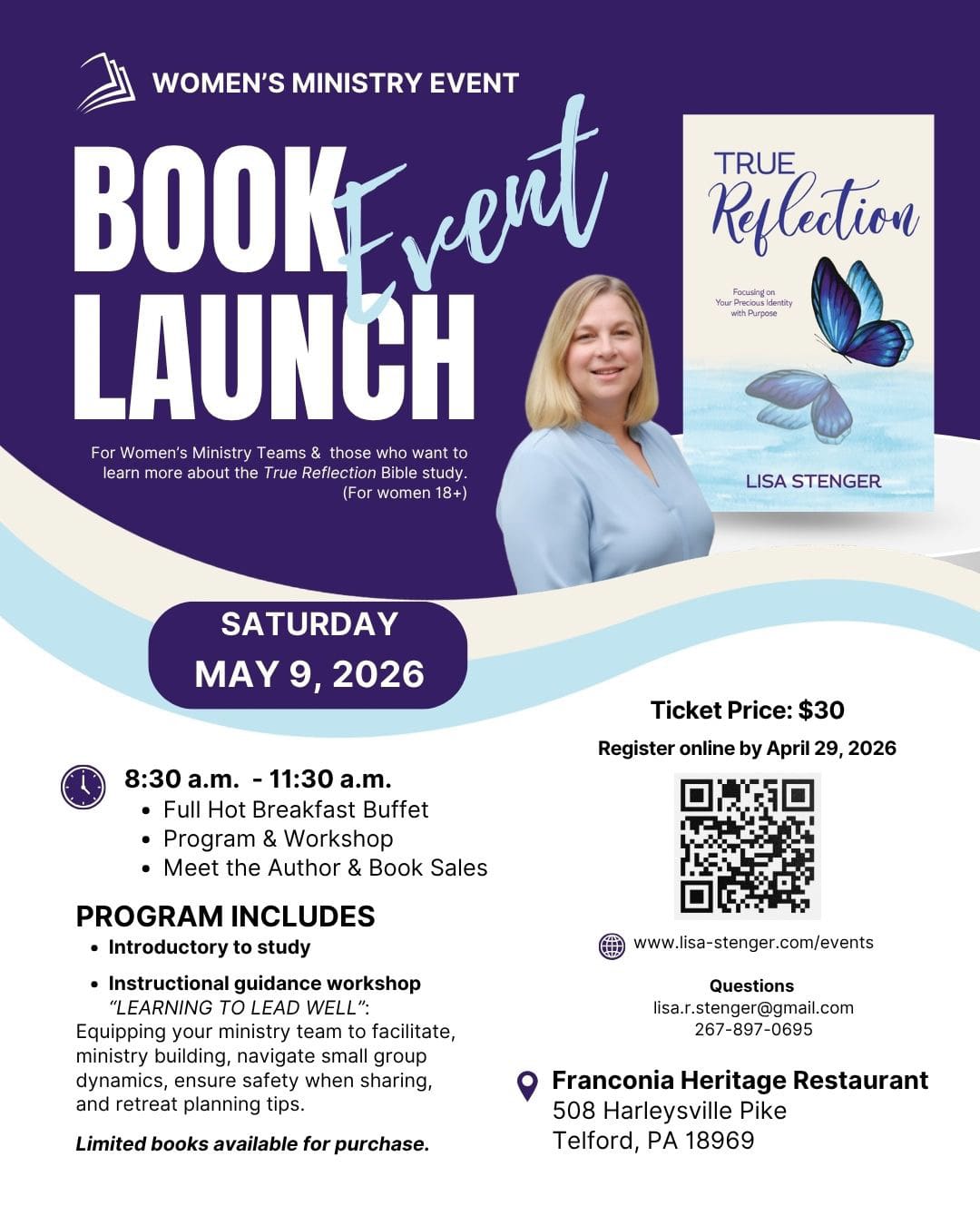 For Women's Ministry Teams & those who want to learn more about the True Reflection Women's Bible Study. Full Hot Breakfast Buffet Program & Workshop Meet the Author Workshop: "Learning to Lead Well" Equipping your ministry team to facilitate, ministry building, navigate small group dynamics, ensure safety when sharing, and retreat planning tips.