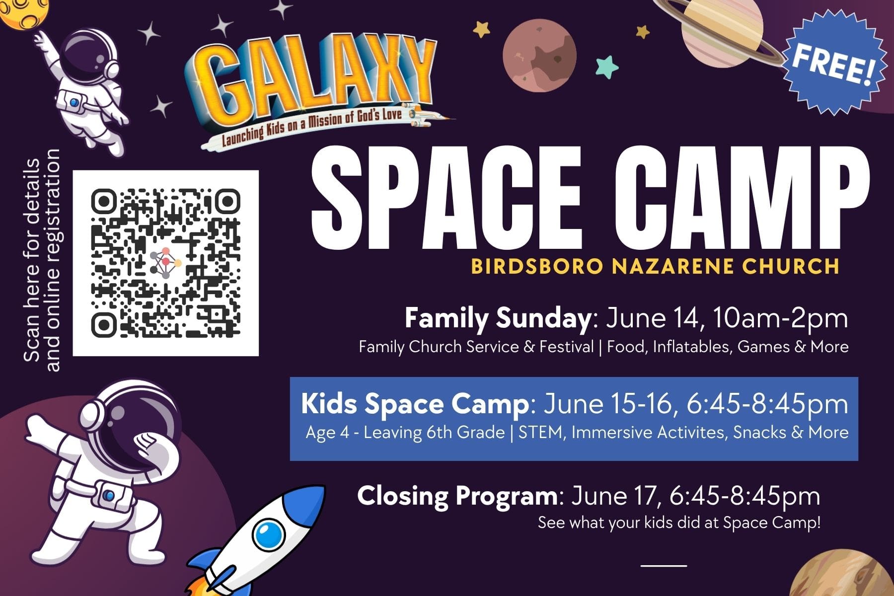 Join us for the BEST event of the summer! Get ready for a cosmic adventure through faith & fun. There will be games, snacks, STEM activities, a service project, and immersive Bible adventures. You will not want to miss it! Get a FREE ice cream voucher for the ice cream truck at the Sunday Festival […]
