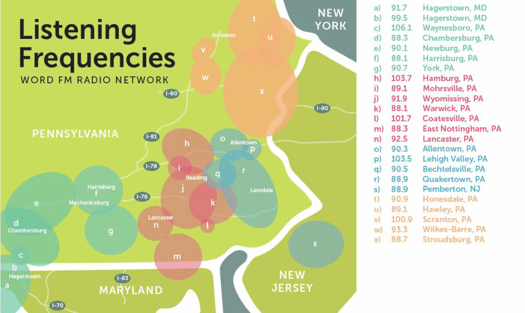 Positive, uplifting Word FM stations can be heard on your radio in central and eastern Pennsylvania, southwestern New Jersey, and northwestern Maryland. [If you’re listening in the Lehigh Valley, set your radio presets to 88.7 FM, 90.3 FM, and 103.5 FM.]